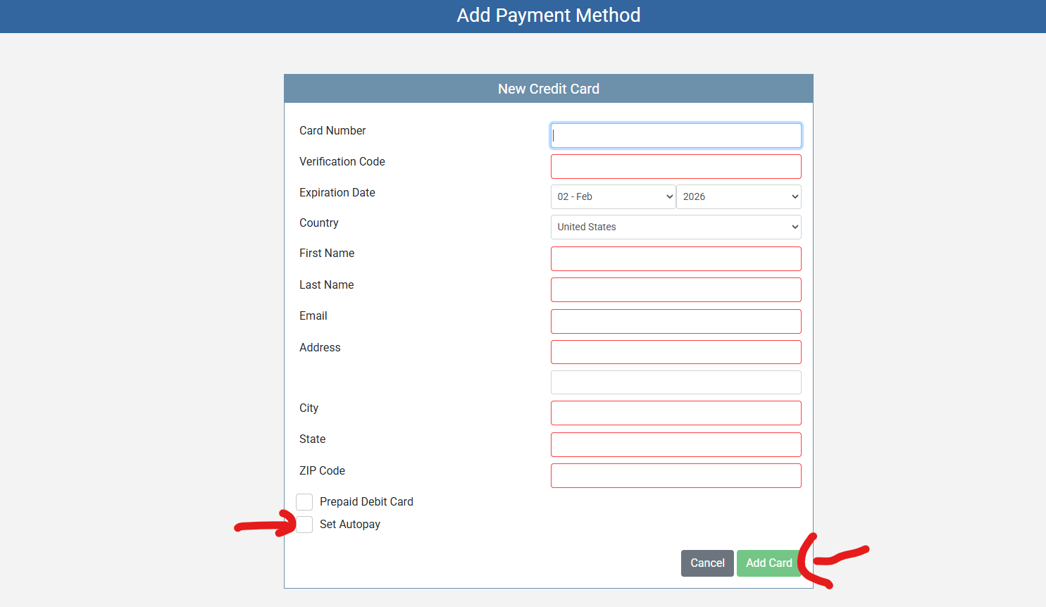 ENTER NEW CARD INFORMATION AND SELECT AUTO PAY IF YOU ARE UPDATING YOUR CARD FOR AUTO PAYMENTS